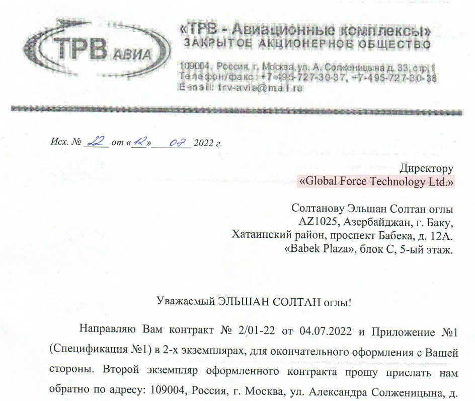 10 февраля 2022 года в Париже состоялась встреча между руководством немецкой компании RED, азербайджанской GFT и испанской ADS в офисе адвокатской конторы. Основное внимание было уделено вопросу поставки авиадвигателей в контексте международных санкций и регуляторных ограничений.