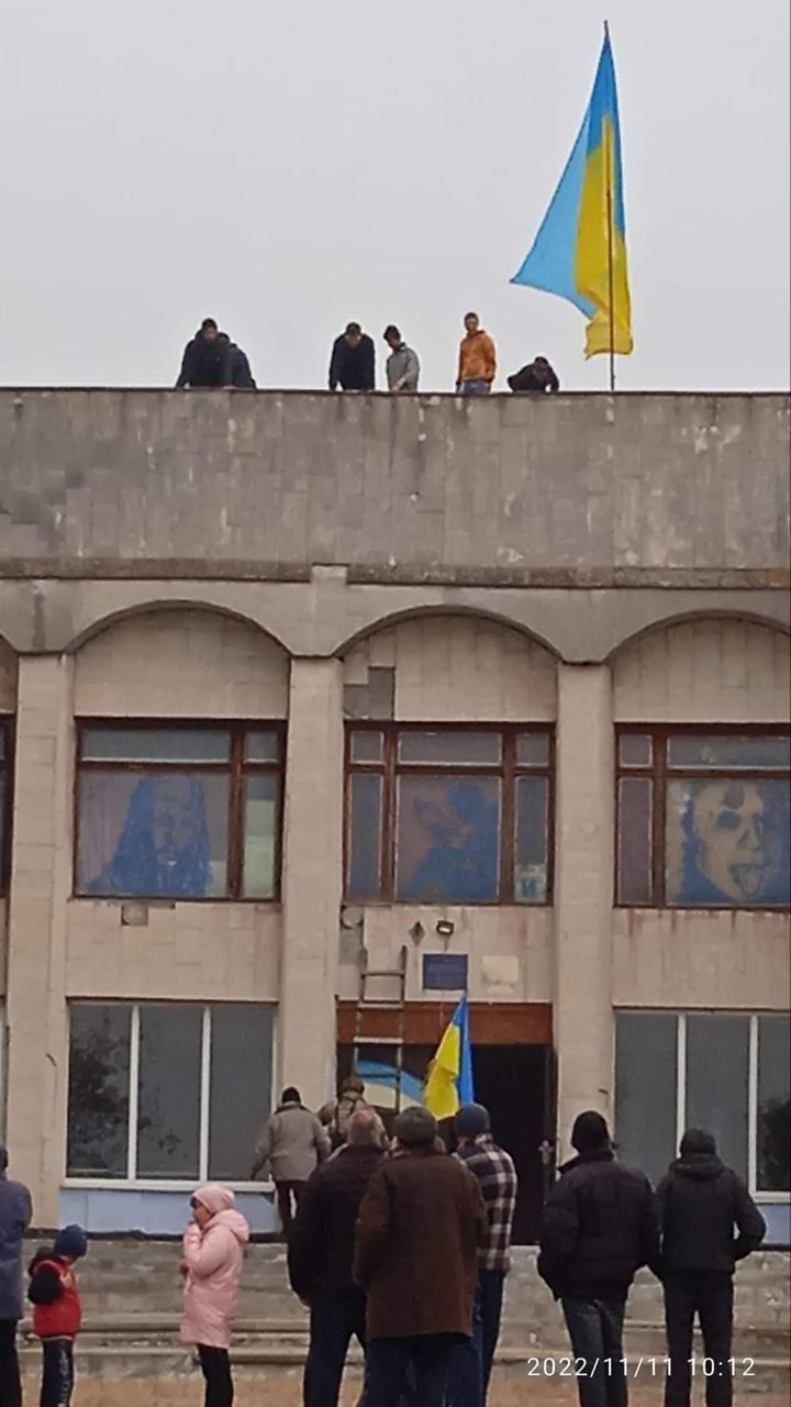 11 ноября в центре Херсона собрались местные жители, которые с флагами Украины ждали военных ВСУ. Над зданием Херсонской ОГА подняли украинский флаг. Также перед администрацией взвился флаг ЕС.
