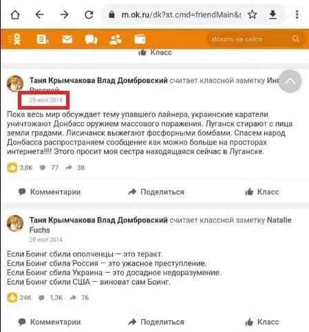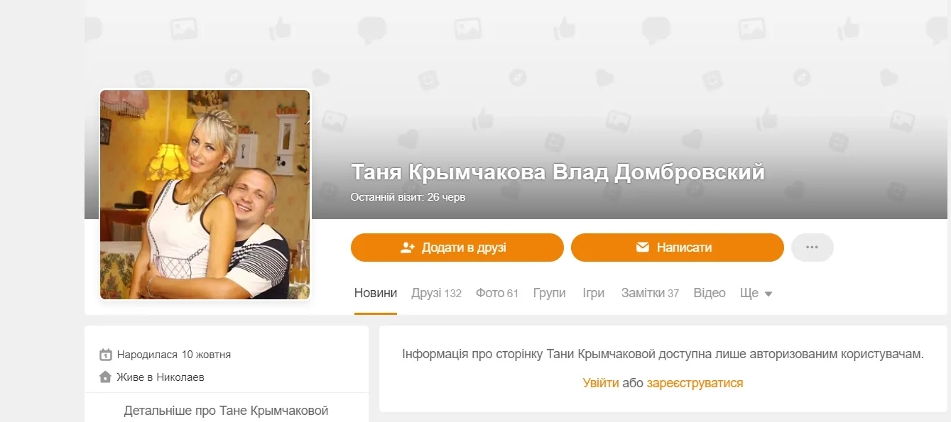 Он поделился скриншотами из социальной сети "Одноклассники". На них активность страницы с именем "Татьяна Кримчакова Влад Домбровский". Вероятно, Кримчакова – девичья фамилия Домбровской, а Владислав – ее муж.