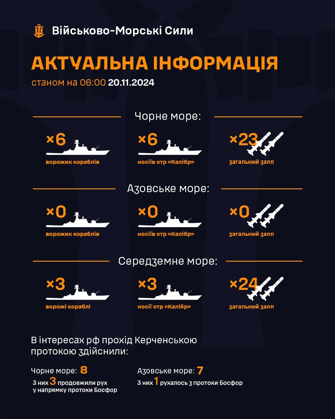 В утренней сводке ВМС сообщили, что по состоянию на 20 ноября в Черном море есть ракетоносители "Калибров". Так, в акватории есть 6 вражеских кораблей.