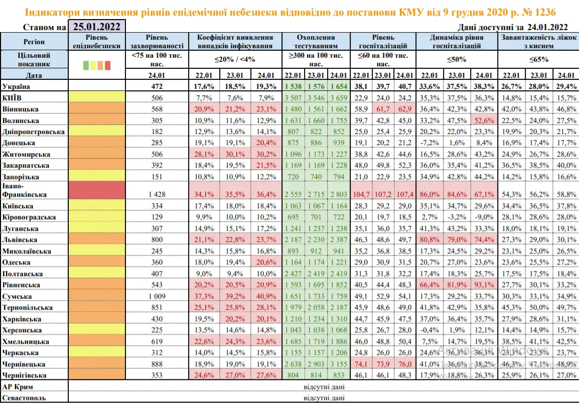 Показатели заболеваемости в Украине по состоянию на 25 января / Инфографика Минздрава
