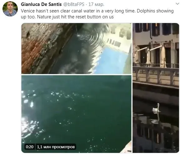 Тысячи сайтов и телеканалов дружно распространили информацию об итальянской Венеции, которая уже долгое время находится на жестом карантине. Из-за того, что по каналам перестали плавать тысячи катеров, вода стала чище, и поэтому в город якобы вернулись лебеди и даже дельфины, которых не видели там 60 лет. Новости сопровождались фотографиями грациозных птиц и милым видео, на котором игривый дельфин резвится прямо у пирса. Некоторые пользователи соцсетей едва ли не благодарили эпидемию, что "показала людям ,как можно спасти мир – надо остановить все".