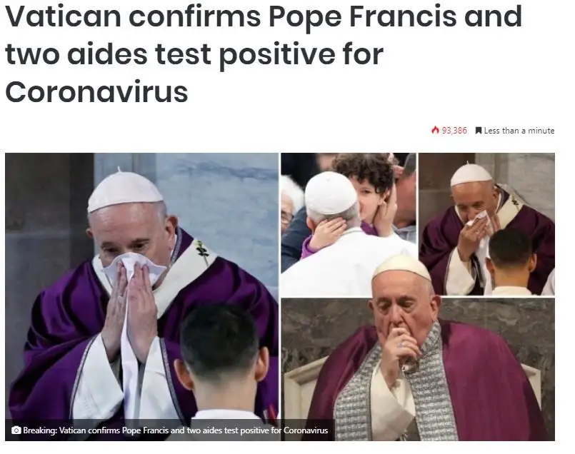 Одним из первых – еще в конце февраля – пострадал Папа Римский Франциск. Влиятельный британский журнал MCM, ссылаясь на источник в Ватикане, сообщил о коронавирусе у понтифика. Новость стремительно подхватили другие СМИ. Пресс-служба Франциска оперативно опровергла информацию: "У Папы Римского только небольшой кашель". Но кому же это интересно?! Коронавирус – другое дело! Руководители МСМ потом оправдывались, что на их сайт кто-то устроил хакерскую атаку и разместил на страницах фейковую новость. Но при этом журнал еще два дня не удалял новость и собирал трафик.