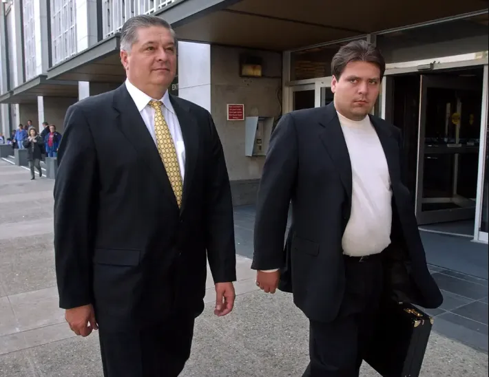 Павел Лазаренко вместе с сыном Александром спешит на судебное заседание в США, 2004 год / фото Paul Sakuma / Associated Press, размещено в авторитетном издании New York Times, которое в своем материале называет Лазаренко "украинским клептократом"