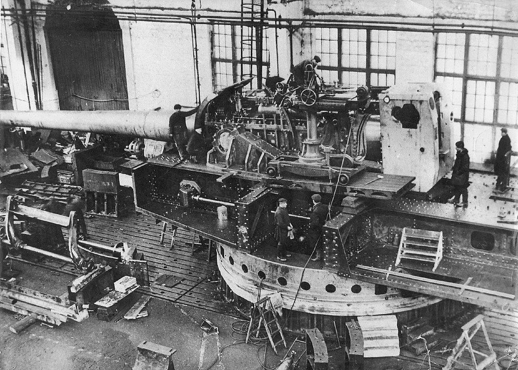 Коарбельная пушка Б-37 в одноствольной опытной установке МП-10 в цехе НКМЗ, 1939 год.
