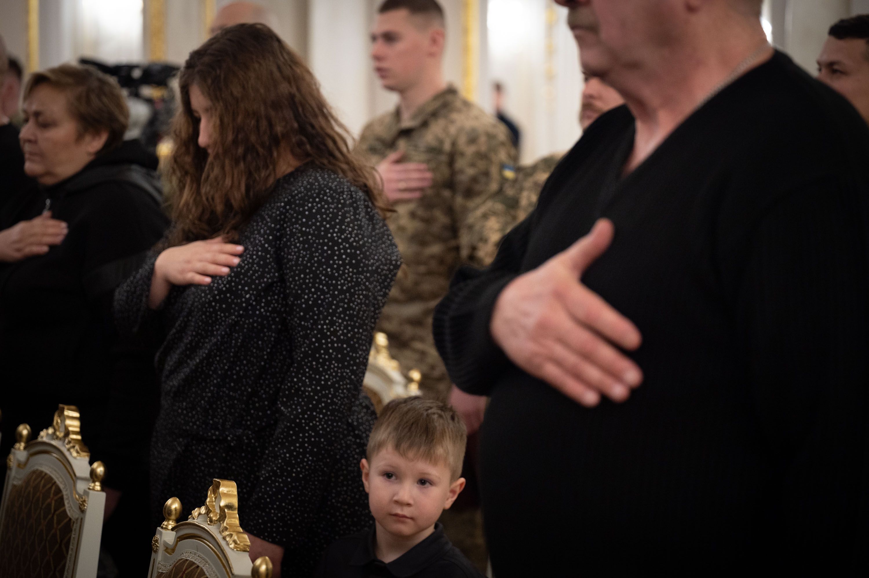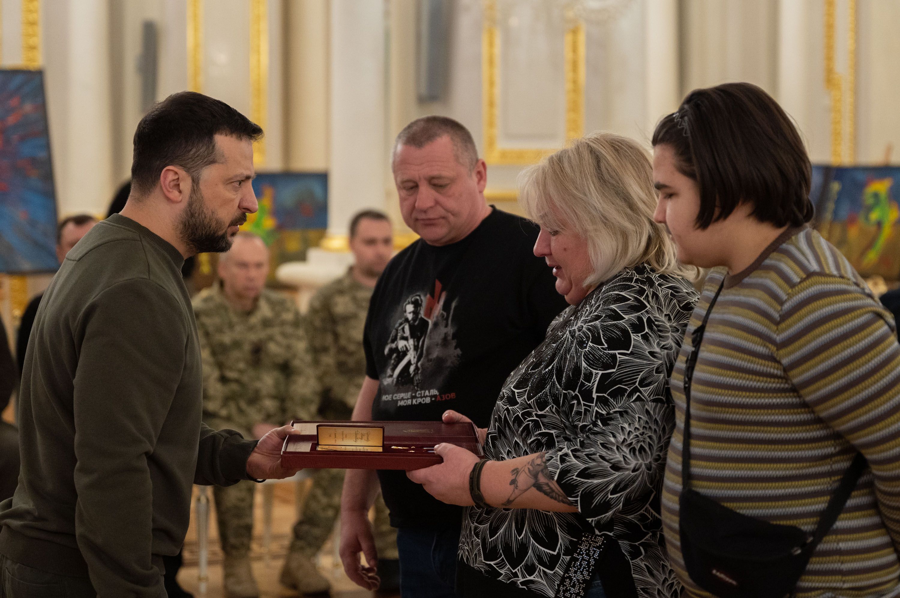 - "Золотую Звезду" – жене и сыновьям Героя Украины младшего сержанта Евгения Волкова, который в марте 2022 года во время эвакуации раненых в Донецкой области сообщил командиру батальона о том, что в тыл подразделения заходит колонна вражеских танков, после чего погиб от вражеского выстрела;