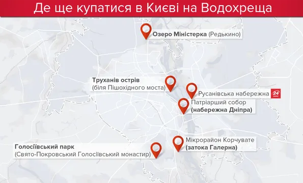 Окунуться в ледяную воду на Крещение в Киеве можно будет в Голосеевском парке возле Свято-Покровского Голосеевского монастыря, на Трухановом острове возле Пешеходного моста, в микрорайоне Корчеватое в заливе Галерная, на набережной Днепра возле Патриаршего собора, на Русановской набережной и на озере Министерка ( Редькино).