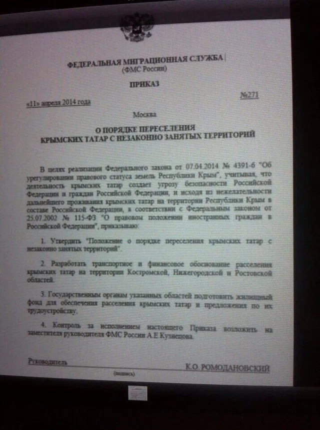На распечатанной бумажки можно разглядеть якобы приказ миграционной службы России, датированный еще 2014 годом, о так называемом "порядке переселения крымских татар с незаконно занятых территорий".
