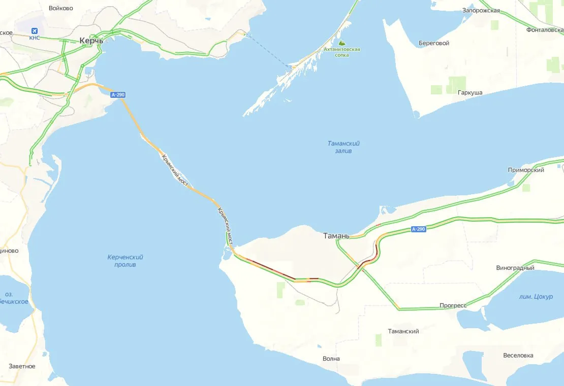 В Краснодарском крае на подъезде к Крымскому мосту уже образовалась многокилометровая пробка. Так, на трассе А-290 в районе Тамани – пробка длиной в несколько километров.