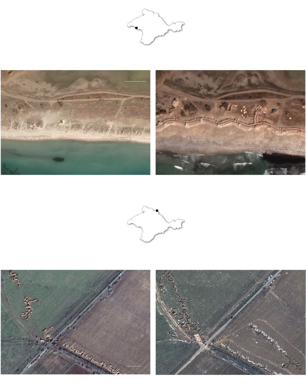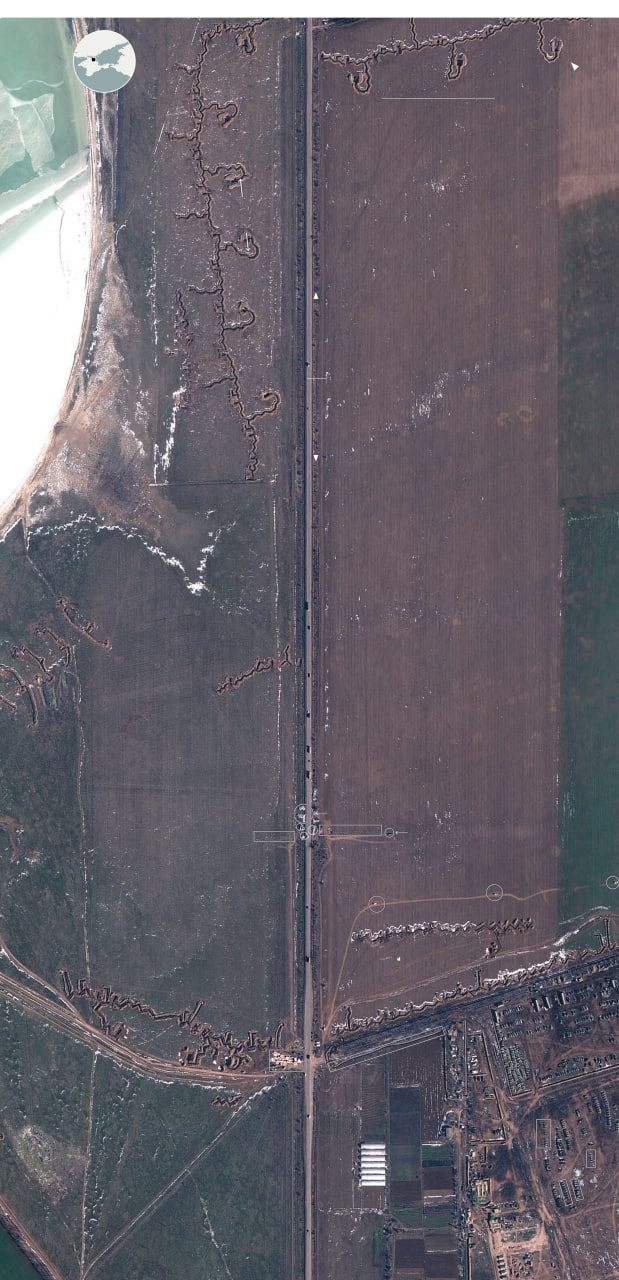 Вокруг Медведевки на севере Крыма захватчики подготовили сложную систему траншей протяженностью в несколько километров. Проходы вырезали под углами, чтобы придать солдатам больший диапазон огня. Рядом расположены другие укрепления, включая глубокие рвы, предназначенные для удержания танков и тяжелой техники.