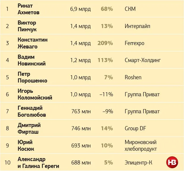 Возглавил престижный список бизнесмен Ринат Ахметов. Его состояние достигает 6,9 миллиардов долларов. Только от финансово-промышленной группы "System Capital Management", которая занимается металлургией, добычей угля и электроэнергии, банковскими операциями, Ринат Ахметов получил 68% прибыли.