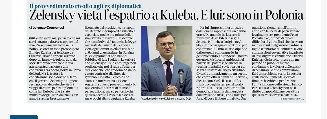 По информации итальянских медиа, Дмитрий Кулеба якобы сказал, что не ожидал, что ему придется "бежать из Украины, как вору". Экс-министр, по данным издания, считает, что его хотят наказать за критику, а в Украине сохраняется советский подход, когда критику воспринимают как враждебность к государству.