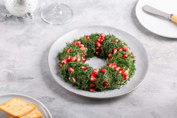 - Щедро покройте салат мелко нарезанным укропом, равномерно распределяя его по всей поверхности. Блюдо украсьте зернами граната.