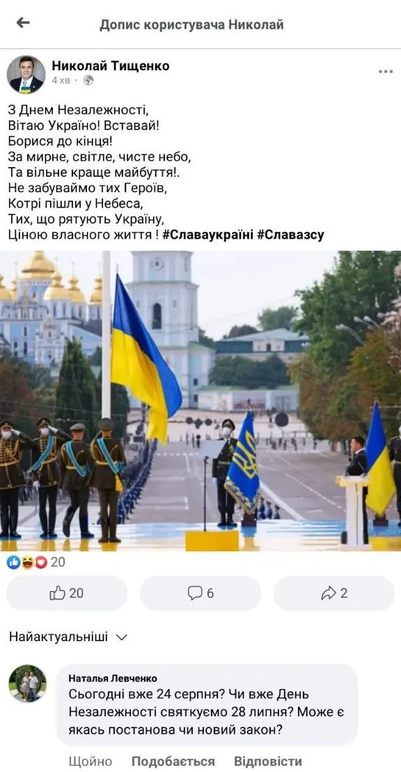Публикация на странице нардепа появилась около 10:55 28 июля. В комментариях под сообщением украинцы возмутились невежеством Тищенко и начали спрашивать, каким образом День Независимости "перенесли" почти на месяц раньше, никого об этом не известив.