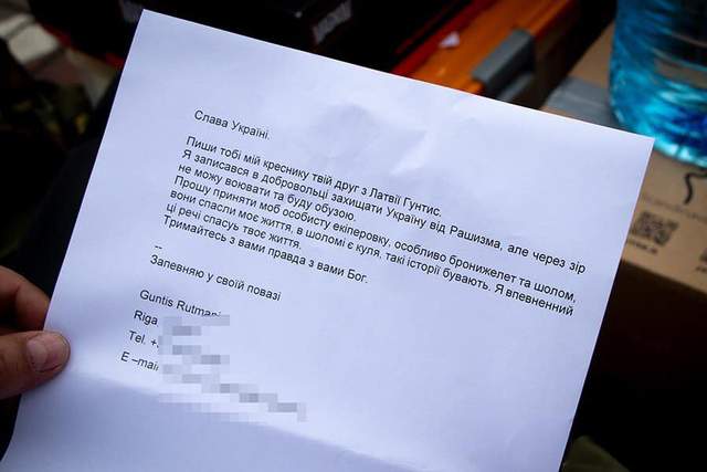 В письме Гунтис просит принять его экипировку, не раз спасавшую ему жизнь. Уверен, что она сохранит мое и приблизит нас к победе над врагом. Я очень благодарю побратима за помощь и надеюсь на живую встречу в Украине по завершению войны,