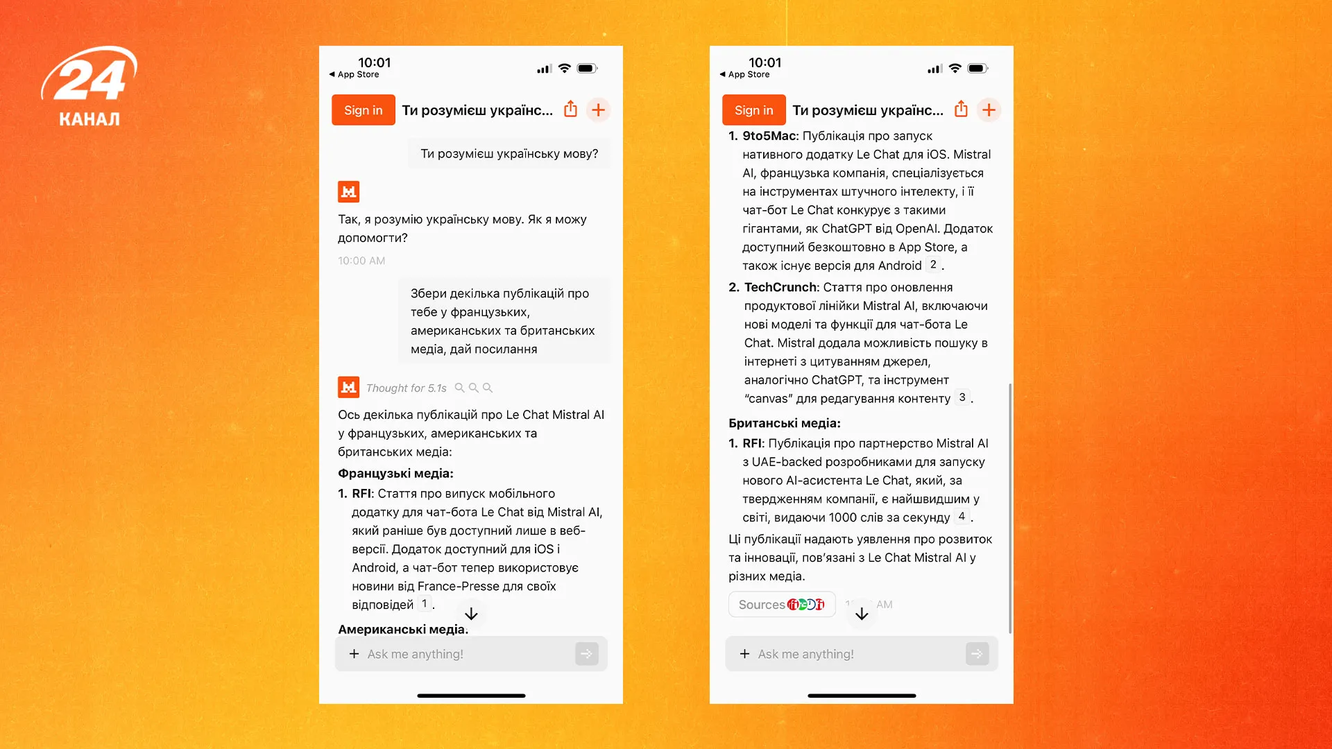 24 Канал протестировал приложение Le Chat на смартфоне. Оно не уступает в качестве ChatGPT в рабочих задачах с текстом, например собирает новости по запросу и предоставляет ссылки.