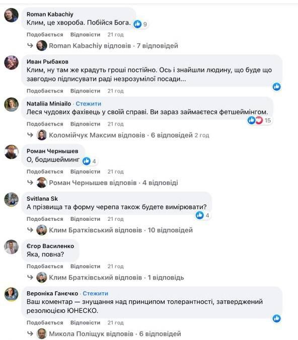 На днях Юрист Клим Братковский в своем фейсбуке заявил, что Леся Гасиджак не может возглавлять музей Голодомора, потому что, по его мнению, "обладает неподходящей внешностью". Он также заявил, что музей Голодомора должен возглавлять человек с "нормальным весом". Нашлись те, кто поддержал его слова и приобщился к травле, однако большинство украинцев возмутили слова юриста.