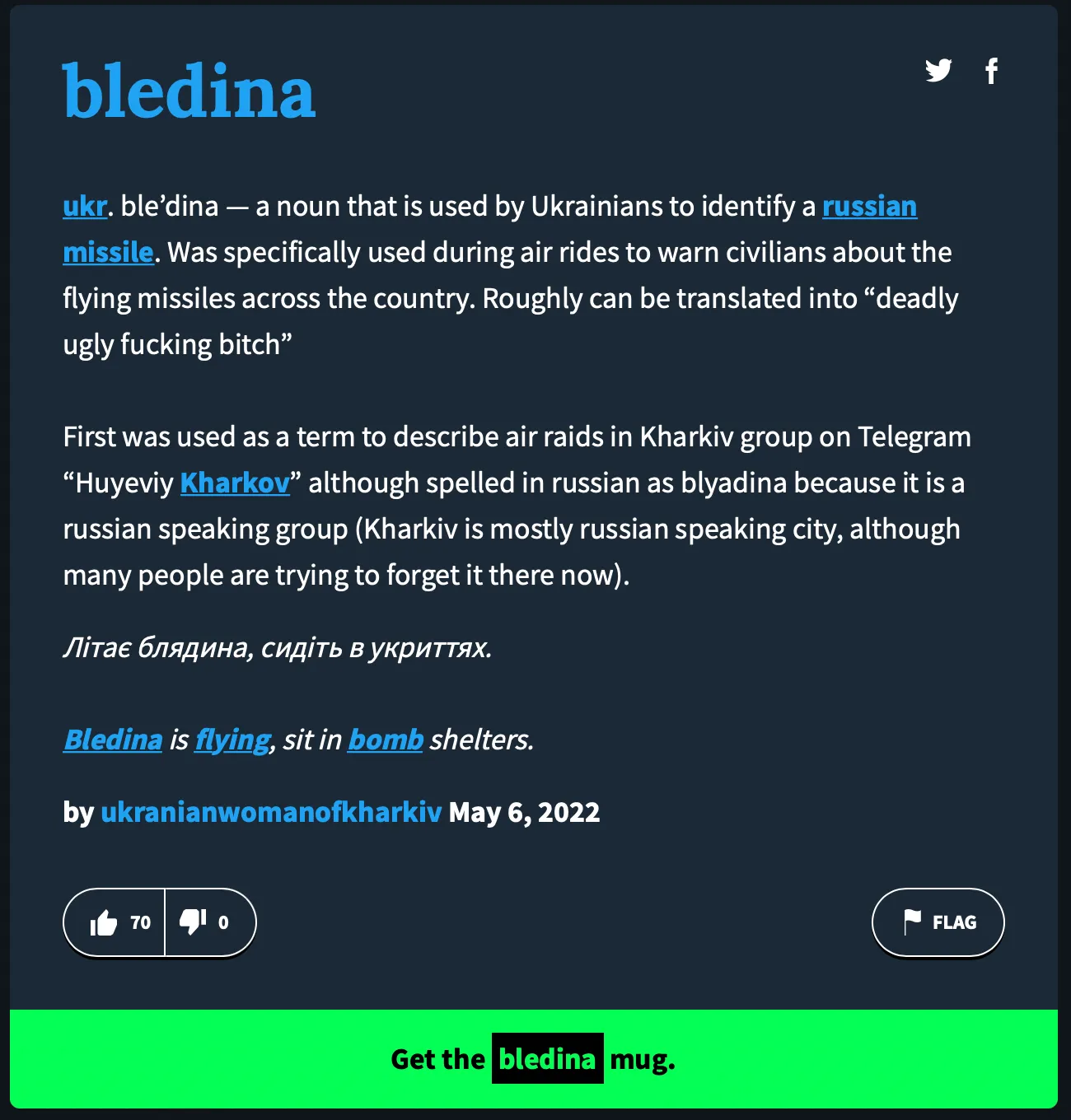 Итак, очередное значение слова "бледина" пополнило словарь сленга Urban Dictionary. В этом случае им обозначают воздушную тревогу или непосредственно российские ракеты, которые могут лететь во время нее. Отсюда и словосочетание "летящая бледина".