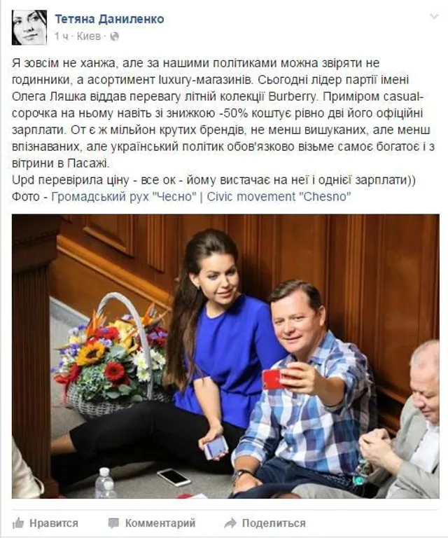 В четверг Ляшко решил покрасоваться перед трибуной в рубашке от люксового британского бренда Burberry, которую в интернет-магазинах можно приобрести минимум за 6,4 тысяч гривен.