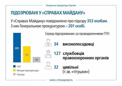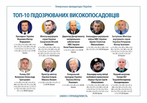 В Генпрокуратуре назвали также ТОП-10 подозреваемых чиновников, которые фигурируют в делах Майдана, среди которых экс-президент Украины Виктор Янукович, экс-министр внутренних дел Виталий Захарченко, экс-глава ГПУ Виктор Пшонка и другие.
