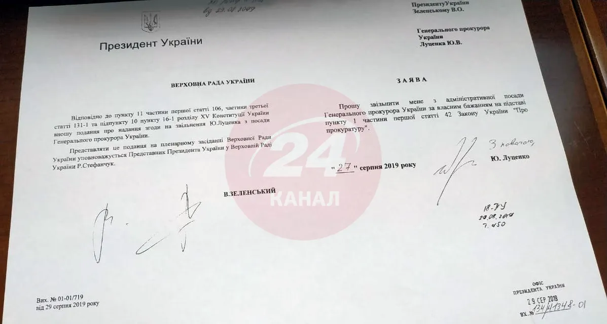В день первого заседания Верховной Рады 9 созыва, 29 августа 2019-го года, Луценко в очередной раз заявил о своей отставке. В интервью с Дмитрием Гордоном он подписал заявление на имя президента Владимира Зеленского.