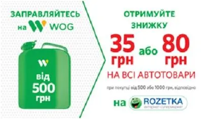 "Забирай свою скидку от Rozetka": в период с 25.09.2016 по 25.10.2016 года включительно на всех АЗС WOG, где действует "ПРАЙД", при заправке горючим от 500 грн в одном чеке клиенты получают промо-код на скидку на автотовары в магазине Rozetka — 35 грн при покупке товаров на сумму от 500 грн и 80 грн — при покупке от 1000 грн.