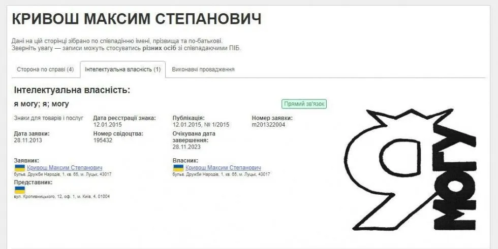 Как выяснилось, на Максима Кривоша была оформлена торговая марка "Я могу". Об этом, ссылаясь на открытые реестры данных, сообщает телеграмм-канал "Klymenko time".