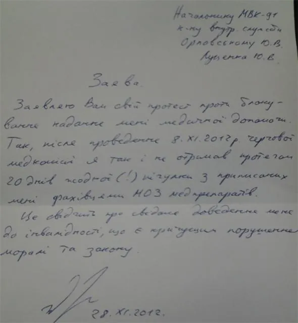 Об этом Юрий Луценко написал в заявлении на имя начальника Менской исправительной колонии № 91.