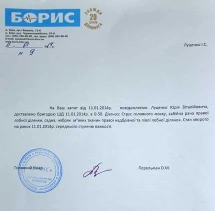 "Несколько часов тому назад я был в больнице, где общался с Юрием Луценко (когда-то мы вместе работали в правительстве) и его женой и присутствовал на консилиуме своих коллег-врачей. В настоящее время состояние Юрия Витальевича стабильное, его переводят из реанимации в палату. Врачи поставили диагноз - сотрясение мозга, также была проведена первичная хирургическая обработка раны в районе лобной доли", - цитирует Поляченко пресс-служба Партии регионов.