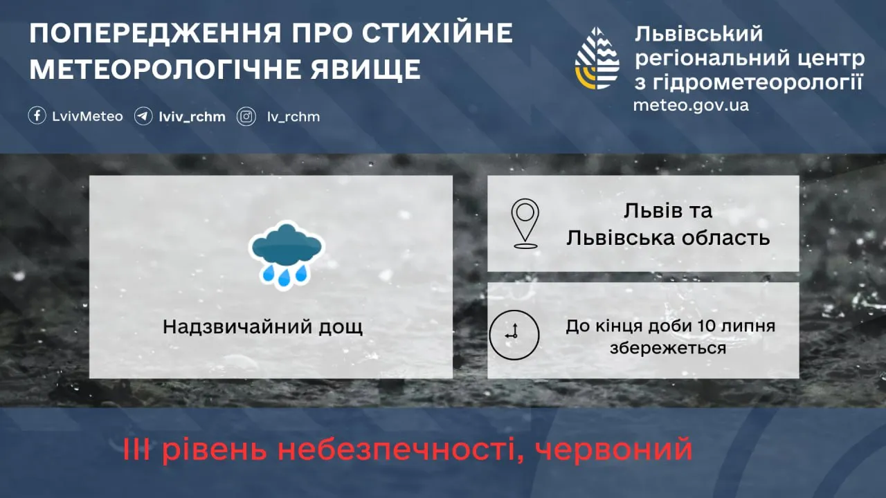 Синоптики предупредили о стихийных метеорологических явлениях во Львове. В четверг, 10 июля, по территории города и области объявлен III уровень опасности, красный.
