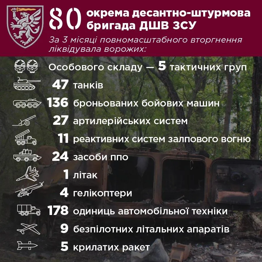"Это лучшие итоги 3 месяцев войны от нашей 80-й отдельной десантно-штурмовой бригады", – сказал городской глава Львова Андрей Садовый.