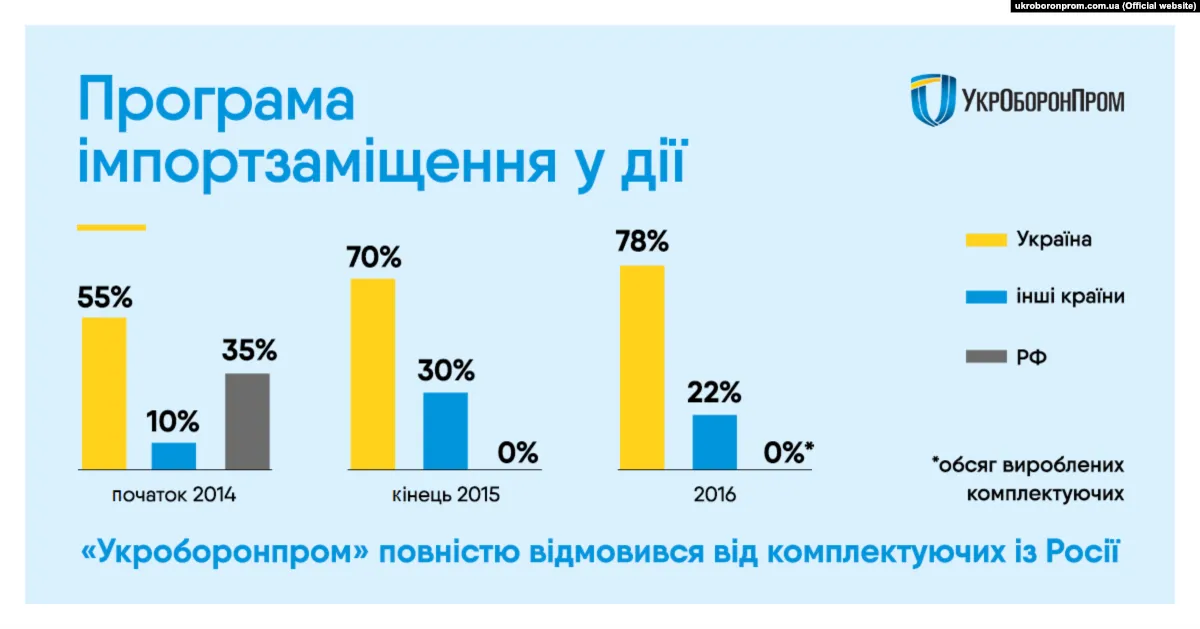 В начале войны лишь половину запчастей для своей военной техники и вооружения Украина производила сама. 10% импортировали из западных стран, 35% – из России. Но уже в концу 2015 года государственный концерн "Укроборонпром" сообщил, что 70% необходимого оборудования производится в Украине, еще 30% закупается в странах Запада. Никакой России. Журналистские расследования опровергли эту информацию.