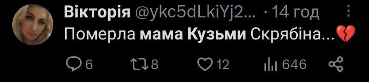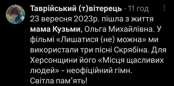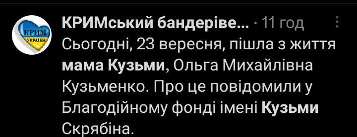 "Не стало Ольги Кузьменко, мамы Кузьмы Скрябина. Светлая память светлому человеку", – написал он в своем телеграме.