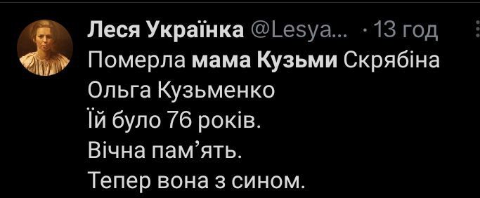 - На 77 году ушла из жизни Ольга Кузьменко – мама Кузьмы Скрябина. Она была писательницей и педагогом, патриоткой Украины и лучшей в мире мамой гениального сына. Это ей он посвятил строчки: "ты меня извини, что я стал взрослым". Певица Руслана рассказала, что для Кузьмы Ольга Михайловна была лучшим другом. А легендарная песня появилась, потому что он обожал слово "мама".