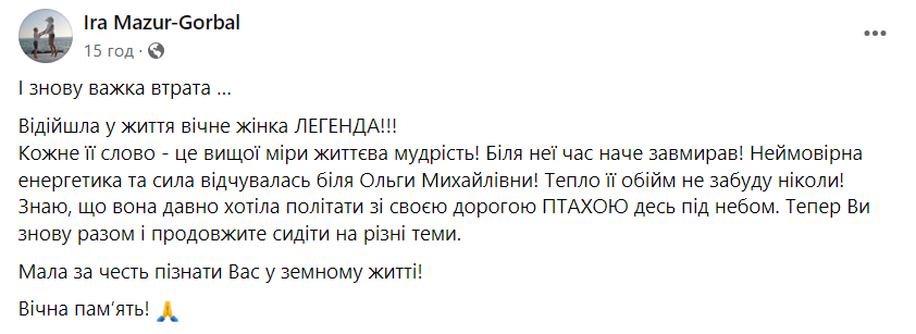На смерть Ольги Михайловны отреагировала также и украинская певица, победительница "Евровидения-2004", Руслана Лыжичко. Она посвятила женщине сообщение в фейсбуке.