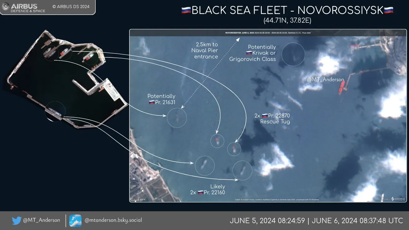 Известно, что OSINT-аналитик MT Anderson опубликовал спутниковый снимок, по которому на утро 6 июня 2024 года все размещенные в Новороссийске корабли ВМФ России покинули акваторию этого порта с неизвестной целью. В издании отметили, что определенной интриги добавляло то, что на утро 5 июня порт Новороссийск уже покинули 2 ракетных корвета проекта 21631 "Буян-М", 2 патрульных корабля 22160 и 2 подводные лодки проекта 636.