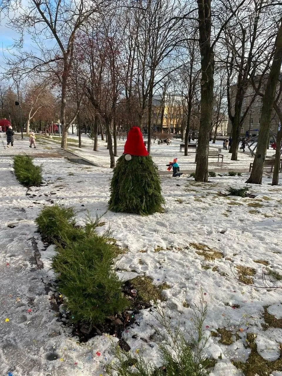 Люди обратили внимание, что на праздники в Мариуполе пострадал не только лед. Вандалы также повредили самую популярную фотозону на Театральной площади. В частности, несколько елочных гномов сорвали с крепежа и перенесли на десятки метров.
