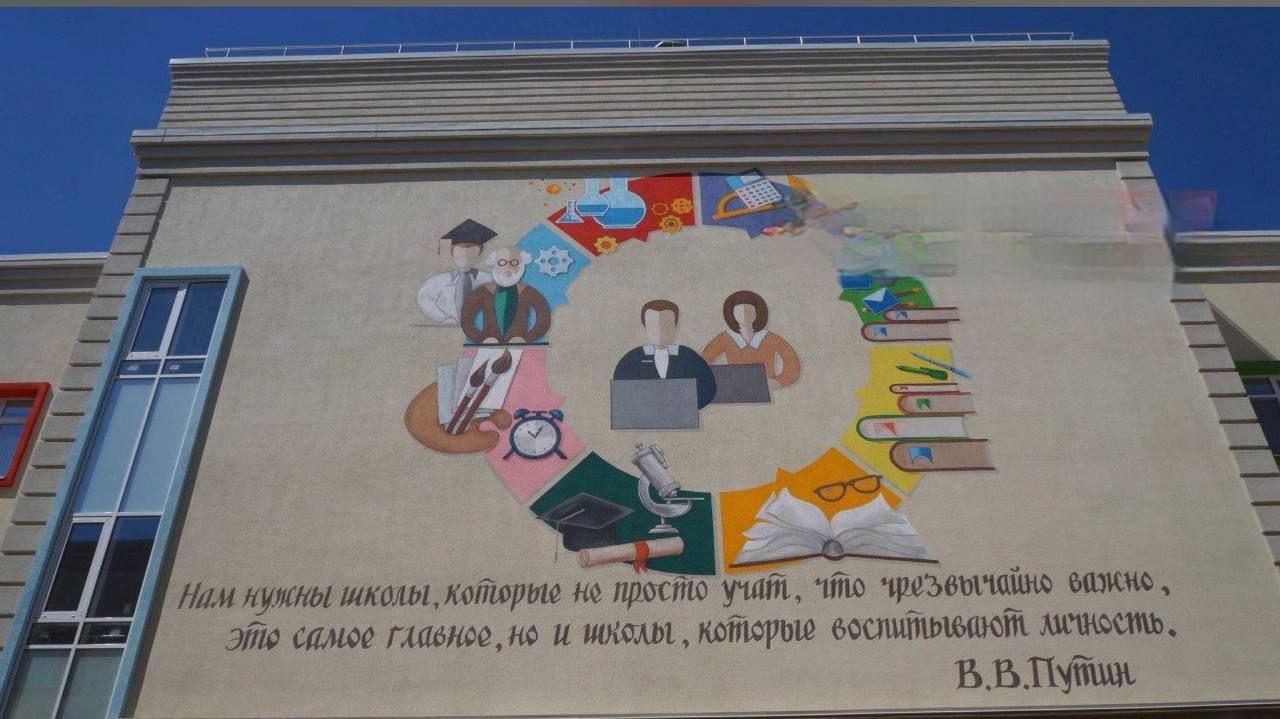 На фасаде новооткрытой школы появился рисунок на образовательную тематику. А снизу можно увидеть цитату человека, из-за которого убили тысячи мариупольцев.