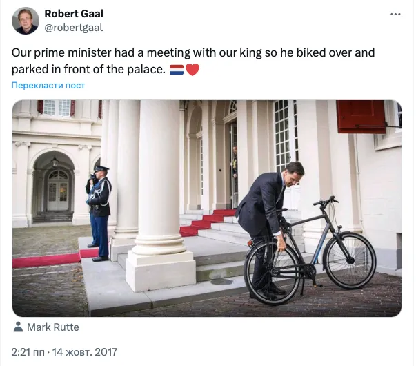 Кроме того, политик упорно использовал старенькую европейскую Nokia вместо американского "айфона", а также ездил на велосипеде на встречу с королем Виллемом-Александром и на обычном SAAB 9-3 – за покупками. Рютте имеет служебное авто – Audi, но не чурается сам выйти из машины, чтобы поднять шлагбаум. При этом для передвижения в пределах города предпочитает именно велосипеды.