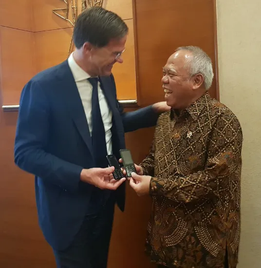 Рютте и индонезийский чиновник Басуки Хадимульджоно демонстрируют общую любовь к кнопочным телефонам Nokia, 2019 год / Фото из соцсетей политика