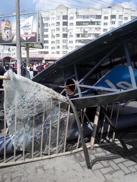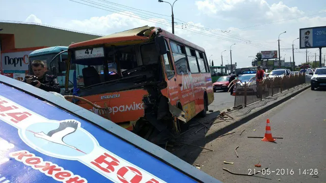 После столкновения рекламный щит упал. Маршрутка наиболее разбита с той стороны, где находится место водителя.