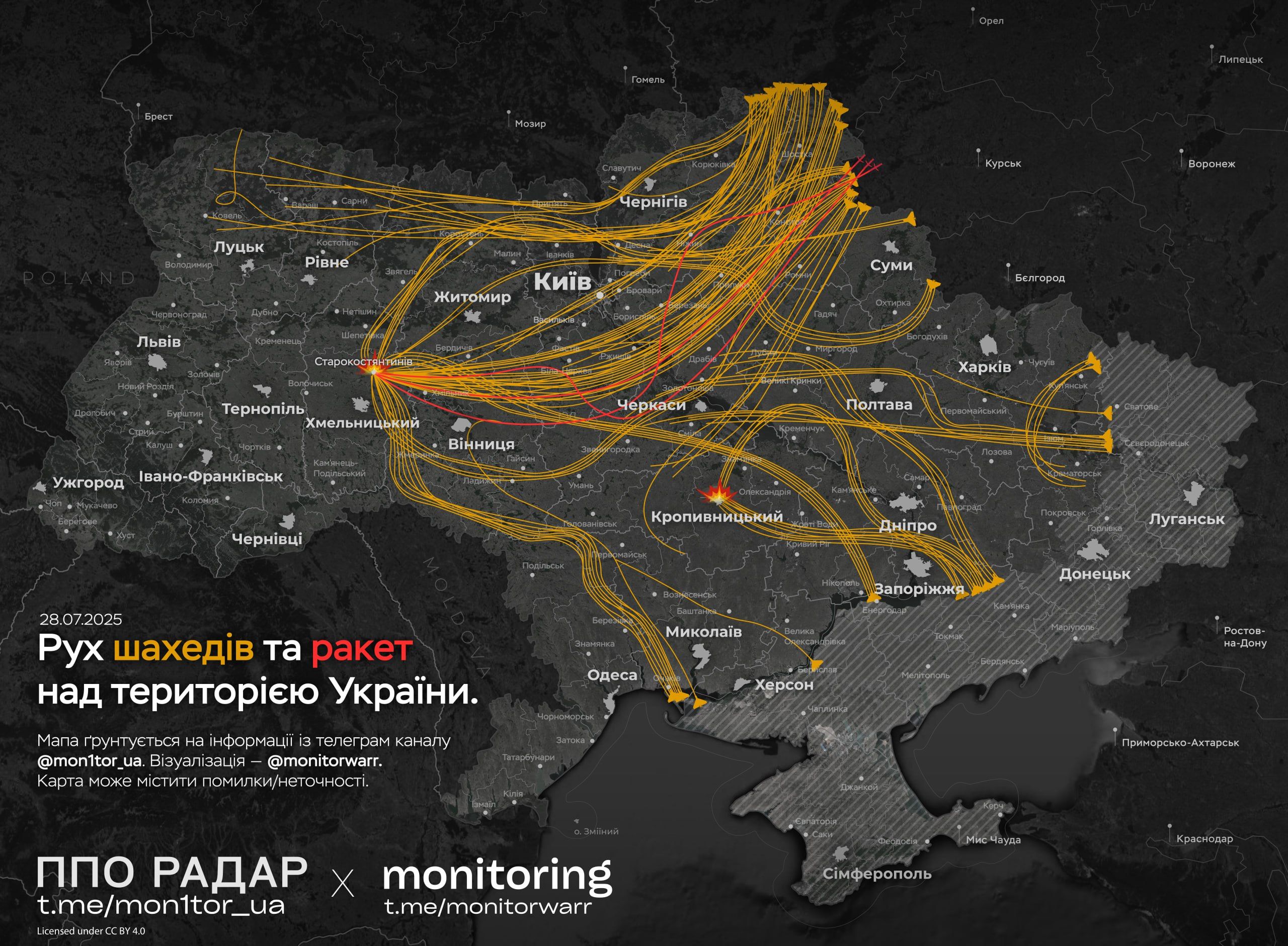 Мониторинговые каналы отмечают, что во время ночной атаки 28 июля враг в очередной раз использовал тактику фокуса на одном городе, по которому бил большими стаями дронов. Под конец атаки оккупанты снова привлекли ракетные средства, предположительно с кассетными боеприпасами.