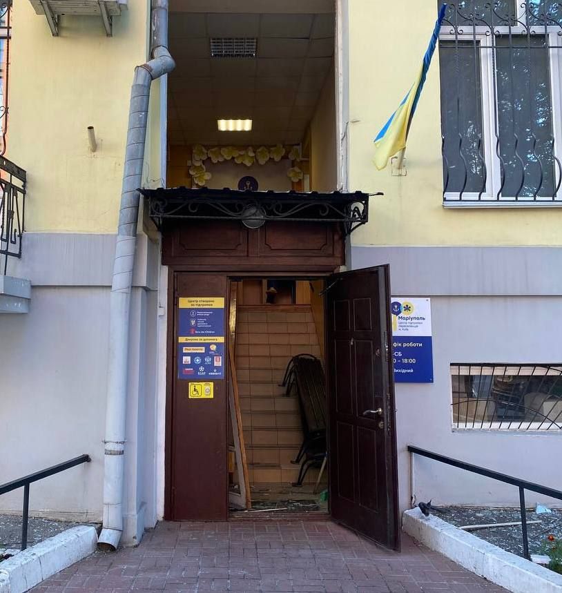 Поврежденный центр поддержки мариупольцев в Киеве