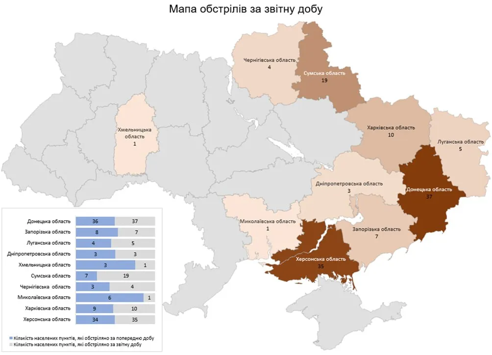 Ситуационный центр Министерства обороны Украины сообщил, что за прошедшие сутки российские войска обстреляли территорию десяти областей Украины. Били из разных видов вооружения – гранатометы, минометы, танки, артиллерия, РСЗО, ЗРК, ОТРК, БПЛА и тактическая авиация. В общей сложности россияне атаковали 122 населенных пункта и 74 объекта инфраструктуры.