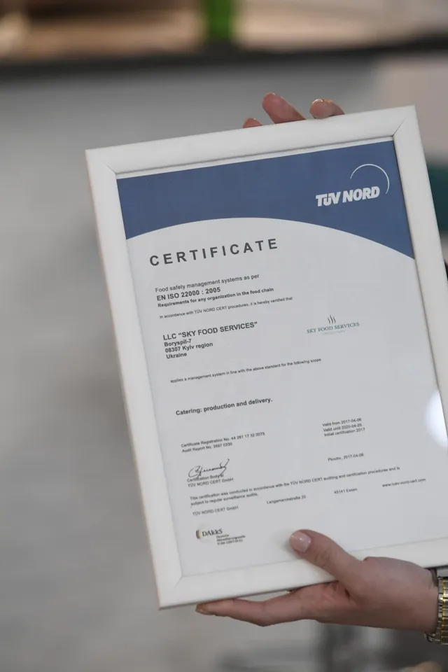 В подтверждение слов о качестве приготовления пищи, Наталья Ямпольская показала сертификат соответствия требованиям международного стандарта ISO 22000: 2005 Компания получила его в марте 2017 года. Этот документ подтверждает, что на предприятии Sky Food Services готовится безопасная продукция. Также этот сертификат дает возможность работать с международными авиакомпаниями.