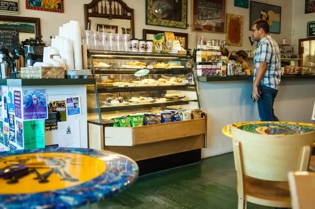 Над входом надувная Годзилла с голой барби в руках, и такая же кукла-супермен как будто летит ее спасать. Здесь очень "loose", как любят говорить на островах. Несвязно и непринужденно. Лучшая кофейня на острове, по мнению местных. Потому что кофе здесь выращен на Гавайях, и это не сетевая кофейня, а единственная такая. Здесь ценят уникальность, локальность и естественность во всем. Первые кофейные деревья прибыли на Гавайи в 1827 году. С тех пор здесь до сих пор выращивают, и это единственное такое место в Штатах. Поэтому гавайский кофе - это нечто особенное.
