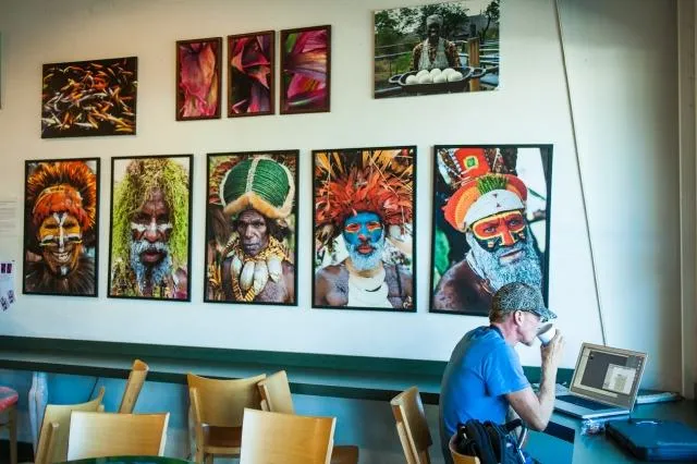 Зашли. Поздоровались с дрэдастой девушкой за прилавком. Заказали кофе - сами себе налили, то есть: здесь так есть, очень непринужденно - "хелп йорселф". Сидим, попиваем и ждем Ника. Здесь спокойно и эклектично. Нешумно, хотя людно и свободных столиков почти нет. Впечатление, что все здесь знакомы друг с другом в той или иной степени. Серферская доска прицеплена к потолку. На стенах картины, фото аборигенов из Папуа Новой Гвинеи - всего подарено владельцу друзьями и ценителями его кофе (как оказалось при разговоре): фотографом для National Geographic, французским шеф-поваром и художником.