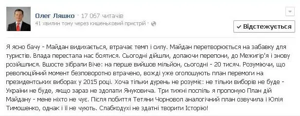 "Я ясно вижу - Майдан выдыхается, теряет темп и силу. Майдан превращается в игрушку для туристов. Власть перестала нас бояться. Сегодня дошли, преодолевая преграды, до Межигорья и снова разошлись. В шестой раз собрали Вече: на первое вышел миллион, сегодня - 20 тысяч. Понимая, что революционный момент безвозвратно потерян, вожди уже объявляют план победы на президентских выборах в 2015 году", - считает Ляшко.
