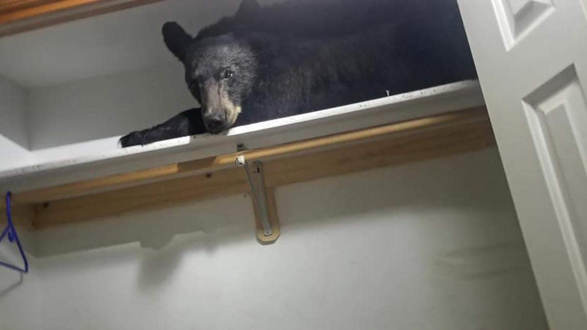Медведь как-то смог проникнуть в прачечную третьего дома, а затем захлопнул дверь изнутри. Он поломал часть мебели в комнате, а затем, очевидно, почувствовал усталость и залез в гардероб, чтобы вздремнуть.