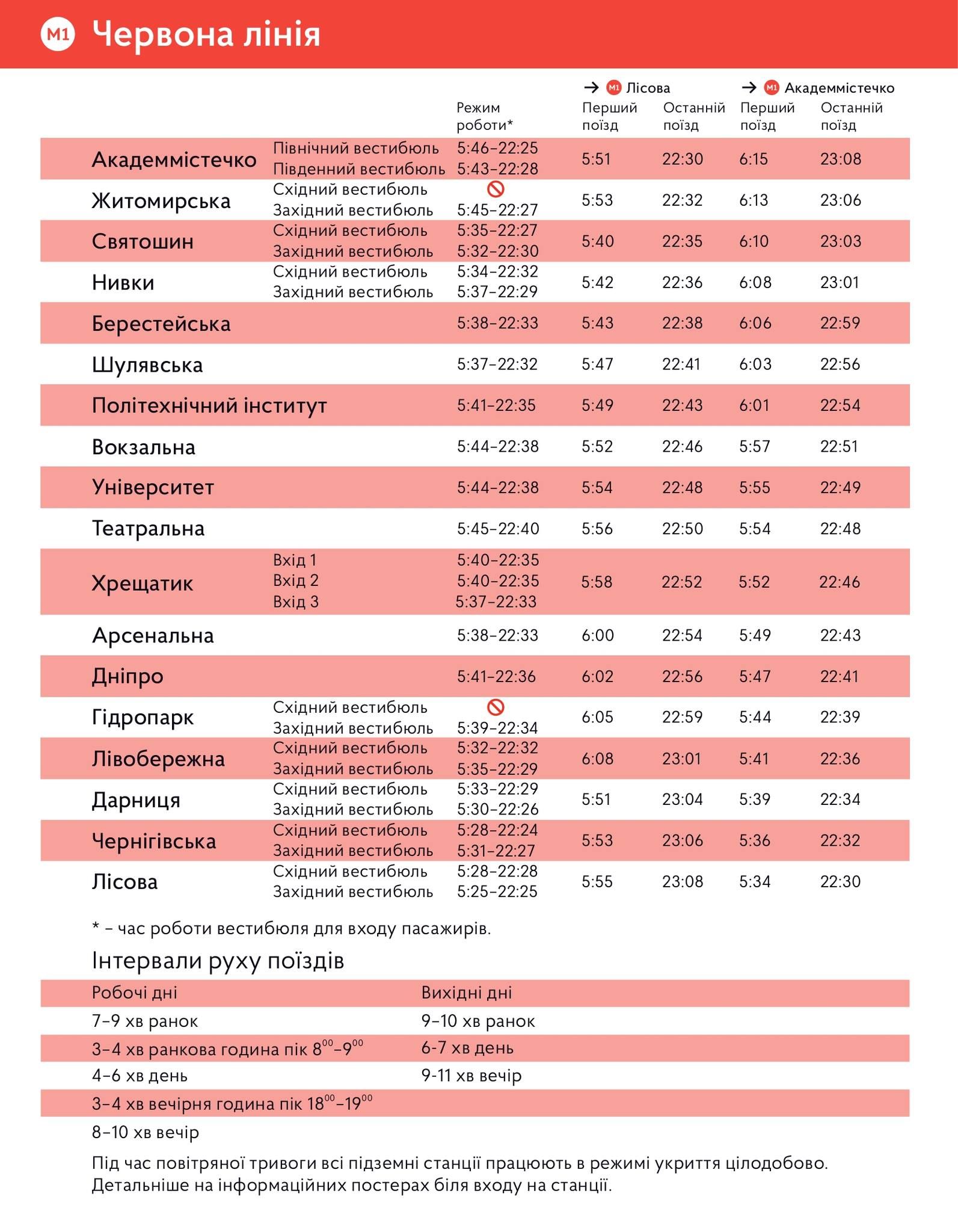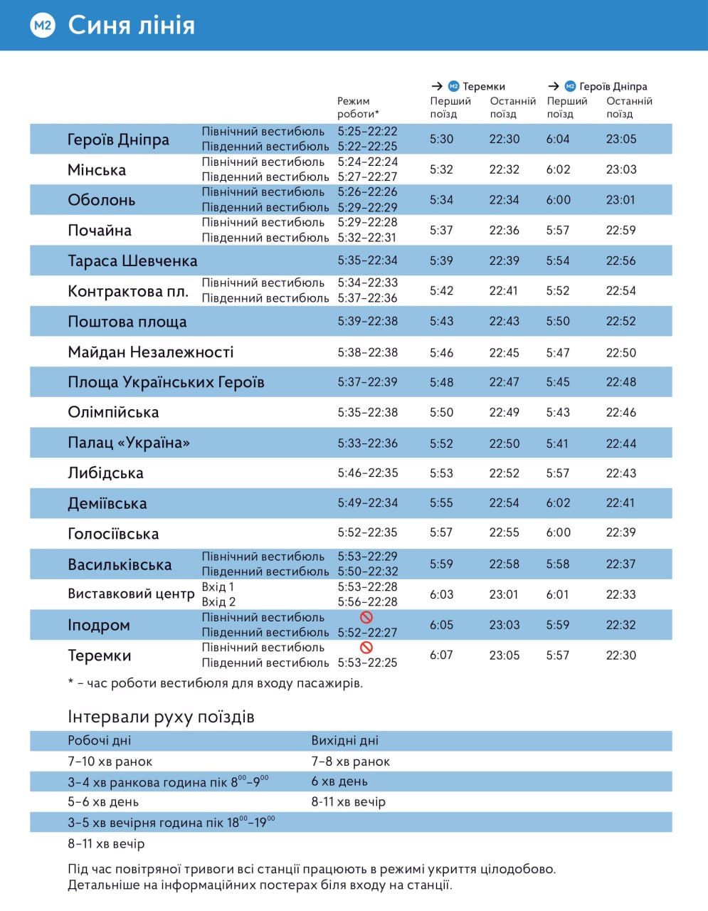 Обратите внимание! Станции "Днепр", "Гидропарк", "Левобережная", "Дарница", "Черниговская", "Лесная", а также участок между станциями "Выдубичи" и "Славутич" во время воздушной тревоги прекращают работу.